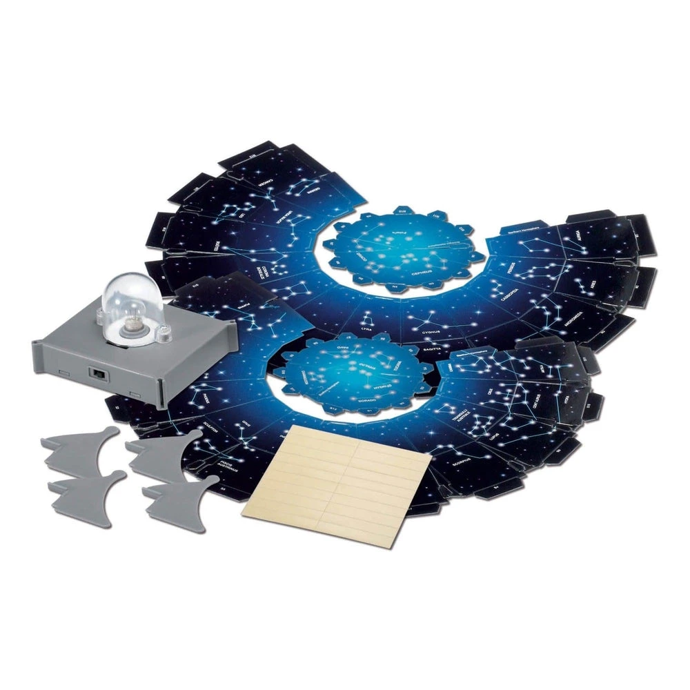 Le kit comprend 2 dômes ciel nocturne : hémisphères Sud et Nord, un socle, une lampe et son interrupteur, 4 supports de dôme, du ruban adhésif, les instructions détaillées pour le montage avec une carte des deux hémisphères.