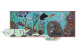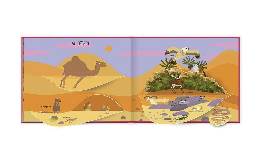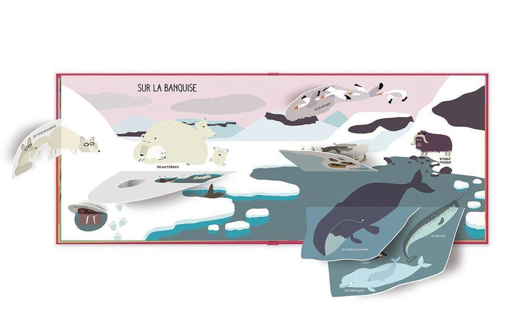 On voit d’abord un superbe décor naturel, aux couleurs soignées. Puis l’enfant soulève des rabats de tailles diverses, savamment superposés, dans un sens ou dans un autre pour faire apparaître tous les animaux qui vivent dans cet univers : la banquise, la mer, la forêt, le désert ou la mangrove. Selon le bon plaisir de l’enfant, c’est ainsi tout le décor qui s’anime et se peuple, à son rythme dans un jeu sans fin !