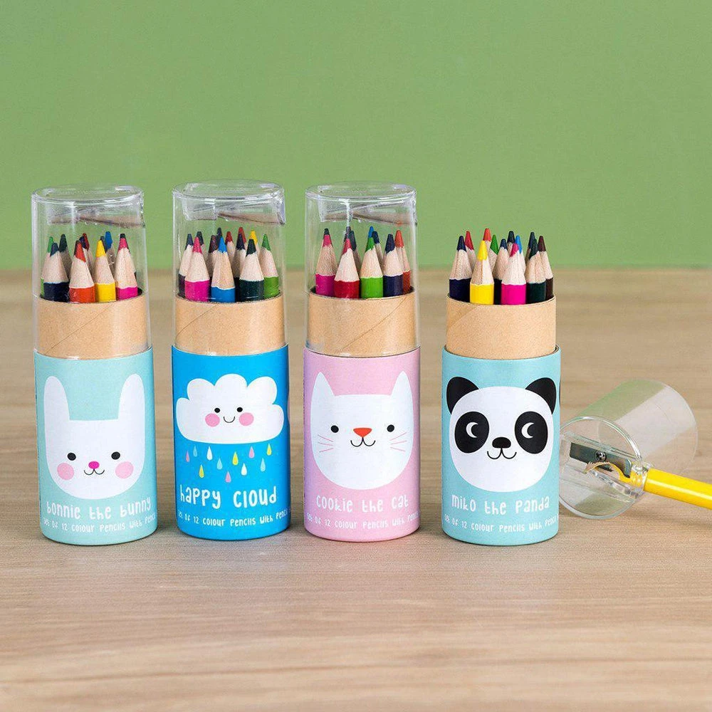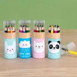 Une jolie boite ronde Miko le Panda avec 12 petits crayons de couleur et un taille-crayon dans le couvercle.