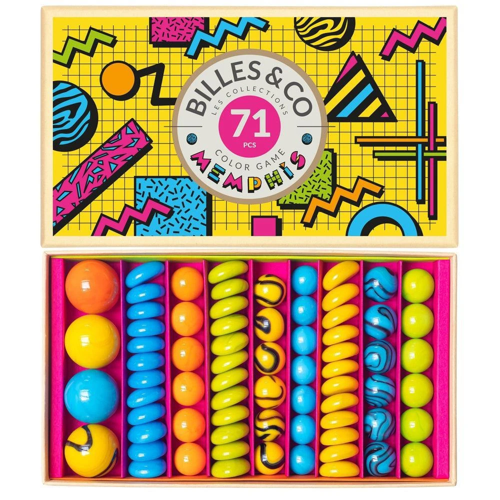Boîte de 71 pièces Memphis contenant 5 variétés de billes, 4 variétés de calots et 3 variétés de billes galet:
