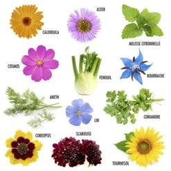 12 sachets de graines : Aster, Aneth, Bourrache, Coreopsis, Coriandre, Cosmos, Fenouil, Scabieuse, Lin vivace, Mélisse, Tournesol, Souci.