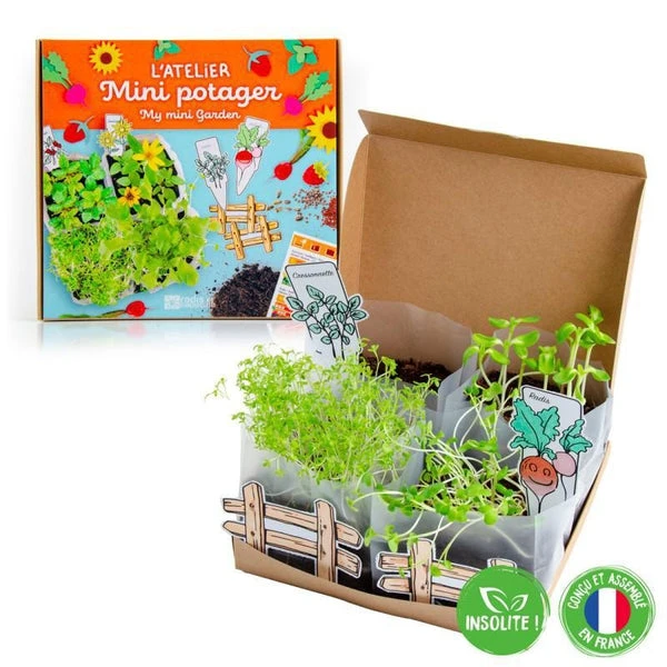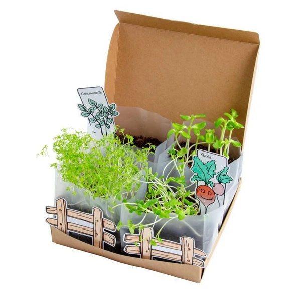Ce coffret offre un premier contact avec le potager, Ă faire dans sa chambre et Ă poursuivre sur son balcon ou un rebord de fenĂŞtre, en ville.