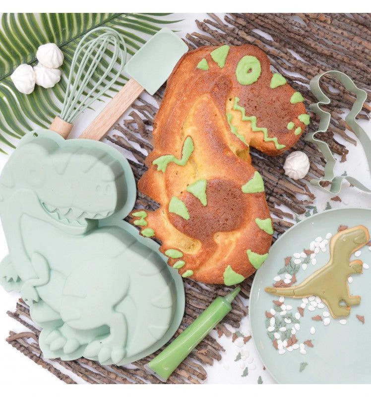 Le coffret contient des ustensiles adaptés aux petites mains de vos enfants : un fouet et une cuillère en silicone, un découpoir dinosaure en inox et un moule dinosaure en silicone aptes au contact alimentaire.