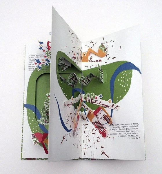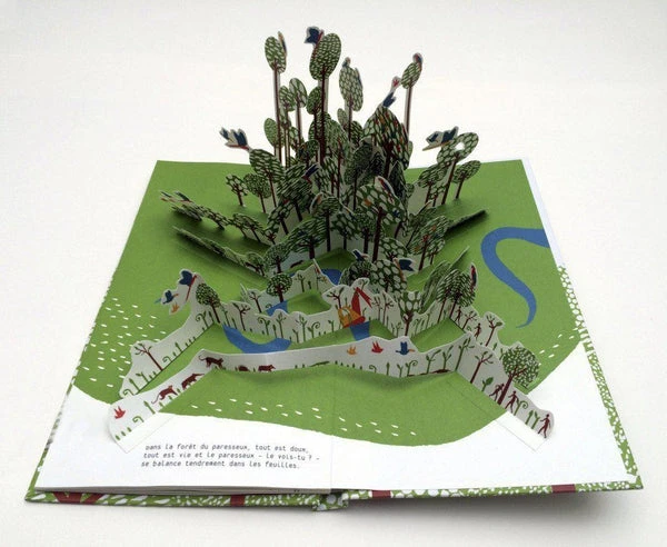 Un pop-up spectaculaire illustrant la splendeur de la forêt amazonienne, tout en mettant en scène la vulnérabilité de cet écosystème, sans défaitisme.