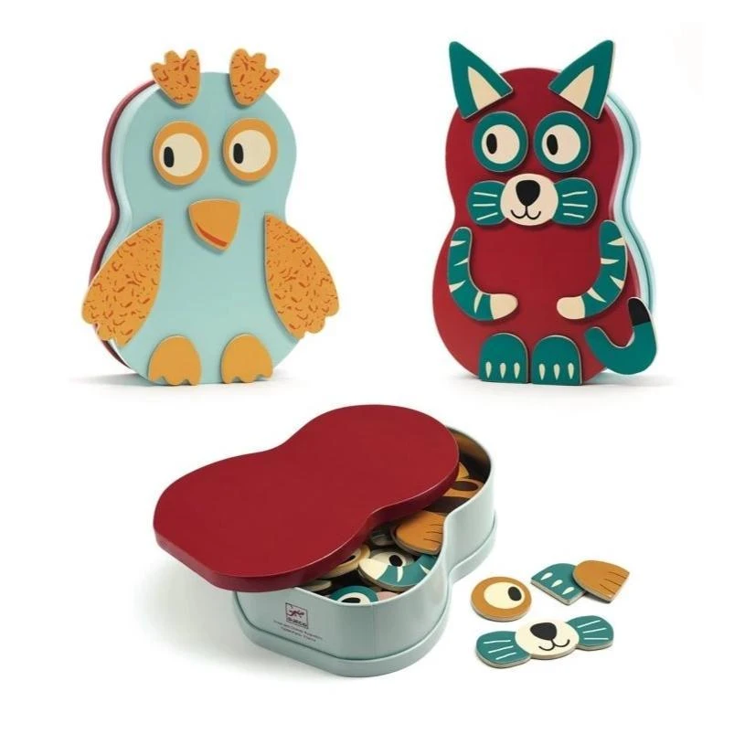 La boite renferme 40 pièces en bois aimantées à placer sur chacune de ses faces pour créer des animaux rigolos.