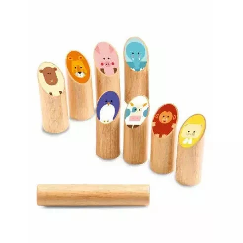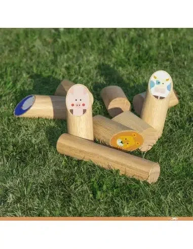 Le jeu se compose de 8 quilles en bois illustrées, un baton, 10 feuilles de score illustrées et un sac de rangement en tissu.