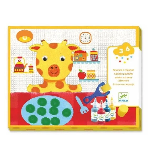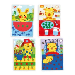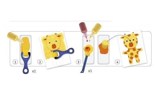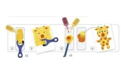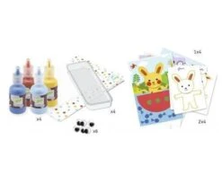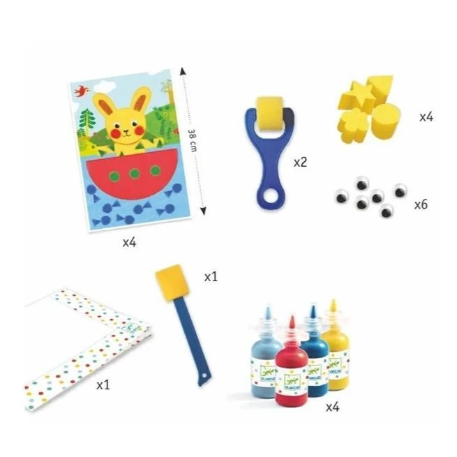 Ce coffret contient 4 affiches à compléter (format 28 x 28,8 cm), 8 planches avec des formes à détacher, 4 bouteilles de gouache, 2 rouleaux, 1 pinceau, 4 éponges, 6 yeux mobiles, 1 nappe, 1 barquette et 1 livret pas à pas.
