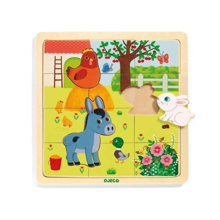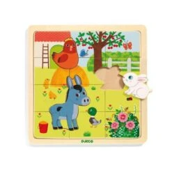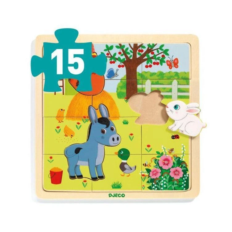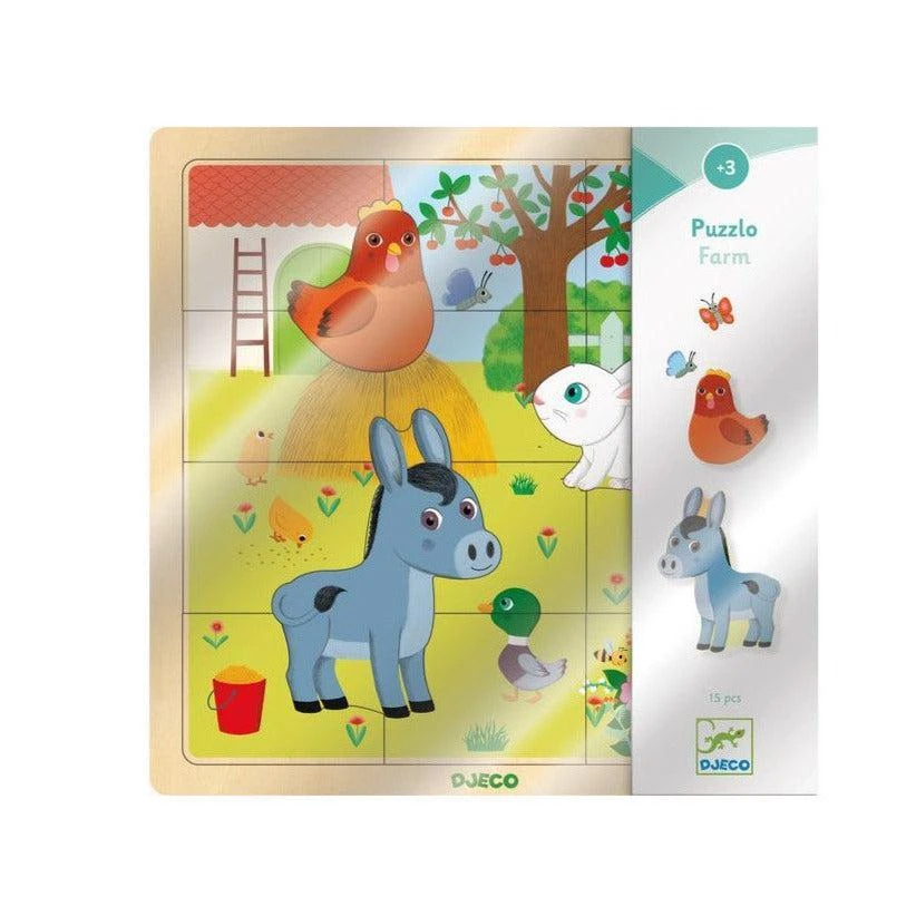 Découvrez le puzzlo Farm de Djeco, un puzzle en bois de 15 pièces pour les enfants à partir de 3 ans.Â