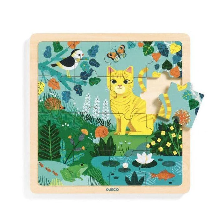 Sur ce joli puzzle en bois sur le thème du jardin, l’enfant reconstitue l’image pour dĂ©couvrir un beau jardin fleurit et de petits animaux.Â