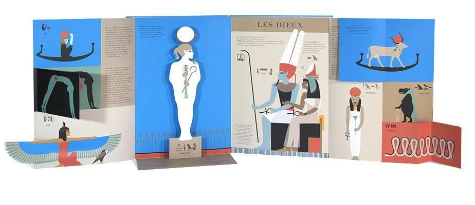 En fin d’ouvrage, une frise chronologique, et une présentation des hiéroglyphes. Chaque partie, accompagnée par des textes de Carole Saturno, est mise en scène par le biais de rabats, de dépliants et autres animations.