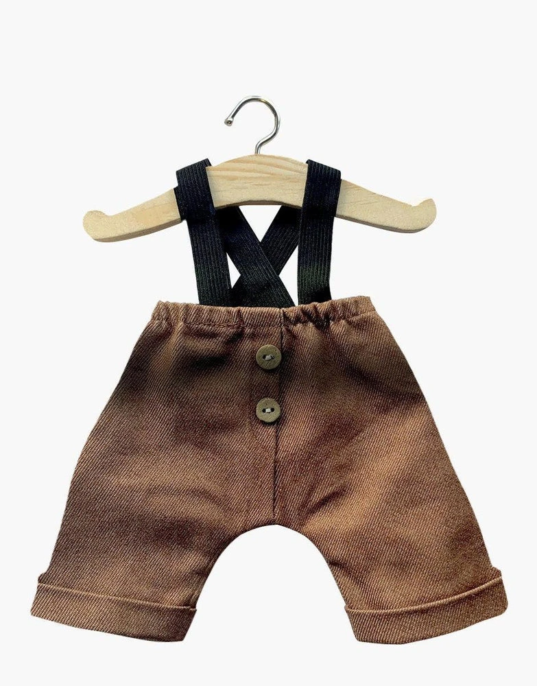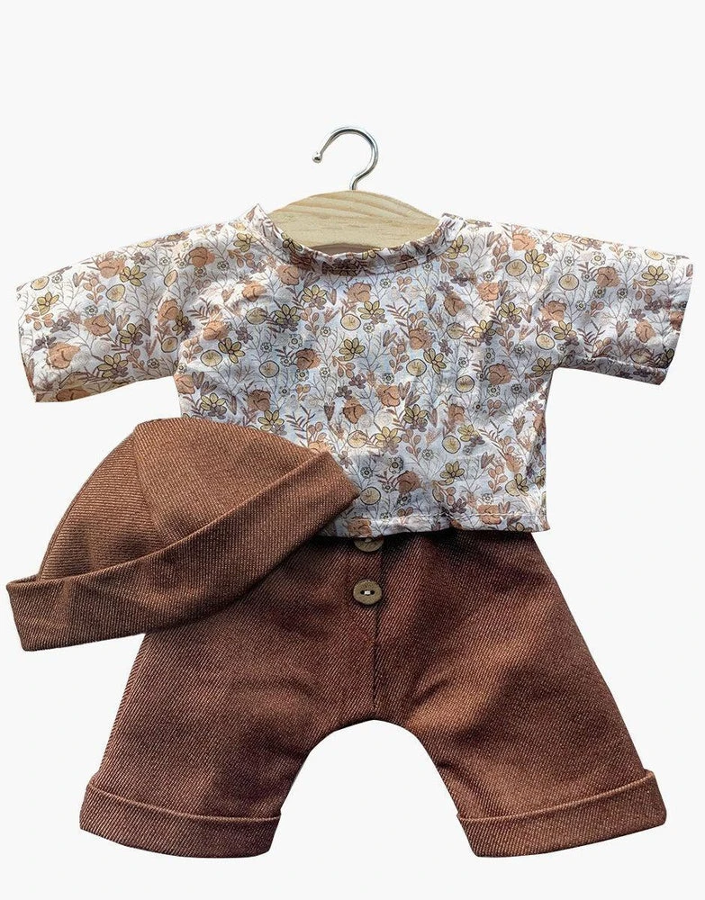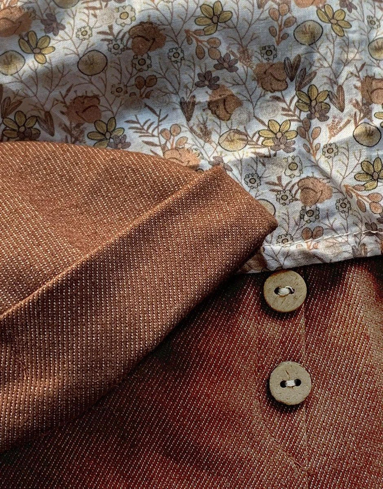 Un petit bonnet au motif végétal, une chemise en lin blanc et un pantalon coton double gaze taille haute à bretelles, pour habiller poupées et poupons d’un look rétro trop craquant !