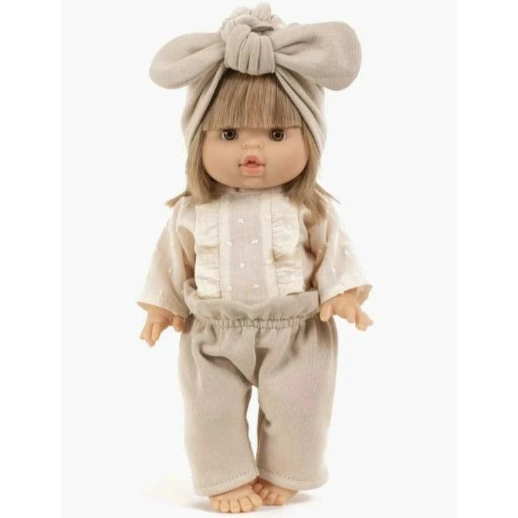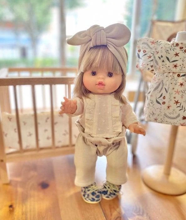 On adore la blouse en plumetis qui apporte une touche d’élégance à ce joli look. Une tenue complète et stylée fabriquée en France, à porter tous les jours ou pour de belles occasions, qui sublime les poupées avec son joli petit turban à nœud associé.