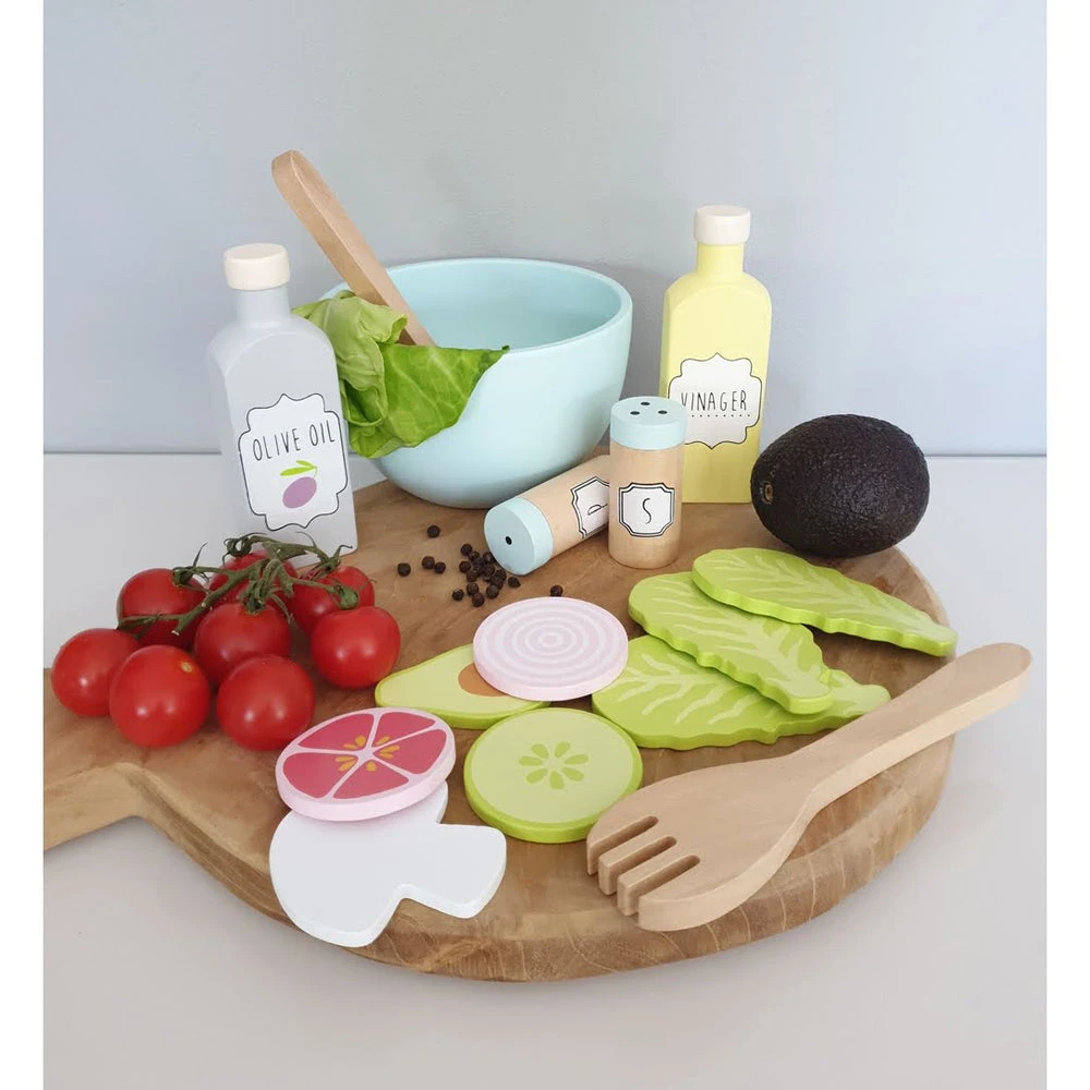 Le set contient : 1 bol Ă salade, 1 couteau en bois et ustensiles Ă salade, 1 bouteille de vinaigre, 1 bouteille d’huile d’olive, sel et poivre, 1 champignon, 1 tomate, 1 tranche de concombre, 1 oignon rouge et 3 feuilles de laitue.