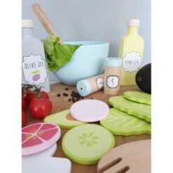 Ce set de dinette en bois de la marque Jabadabado contient tout ce qu’il faut pour prĂ©parer une grande salade gourmande: laitue, champignons, tomates, concombre, oignons rouges et condiments…Tout y est !