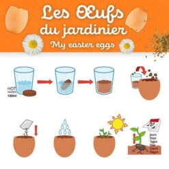 Le kit contient 4 pots de culture en forme d’œuf de terre cuite, 4 pastilles de terre de coco à réhydrater et 1 sachet de graines de petites marguerites