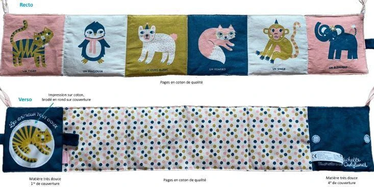 - Un livre en tissu, dès 3 mois : le premier livre des bébés tout doux et tout mignon (Où va petit singe ? ou Les animaux selon disponibilité fournisseur)