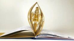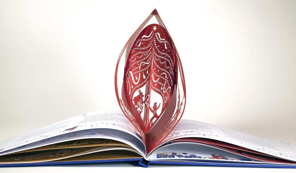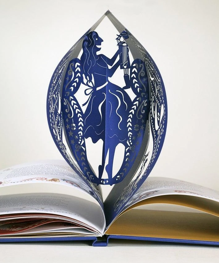 Narrée dans une langue simple et accessible qui laisse toute sa part au mystère, l’aventure du petit Casse-Noisette et de la jeune fille est ponctuée de quatre pop-ups en paperscope, s’ouvrant au cœur même du récit. Le lecteur appuie légèrement du doigt pour arrondir le cylindre dans lequel, comme au bout d’une lunette, apparaît la scène ou le personnage de papier. Magique !