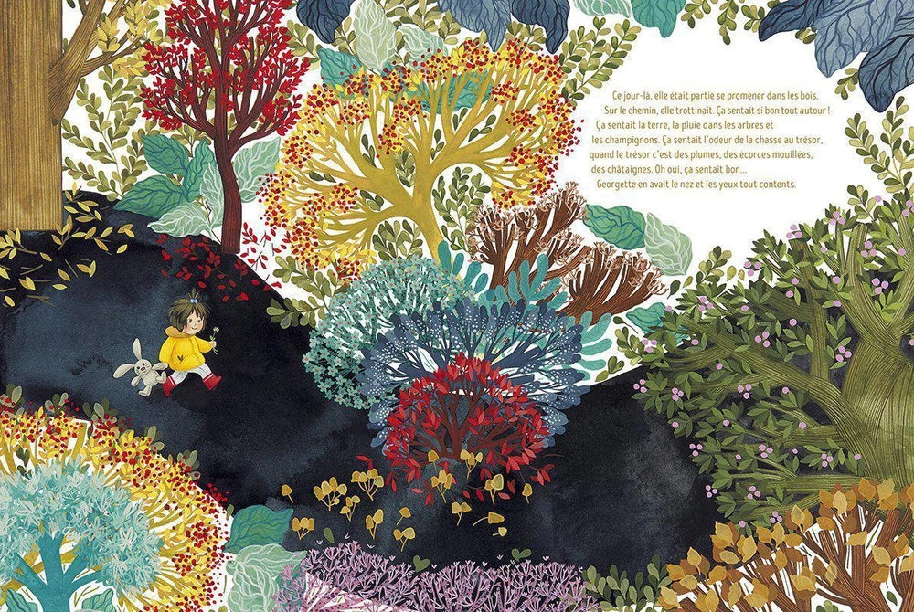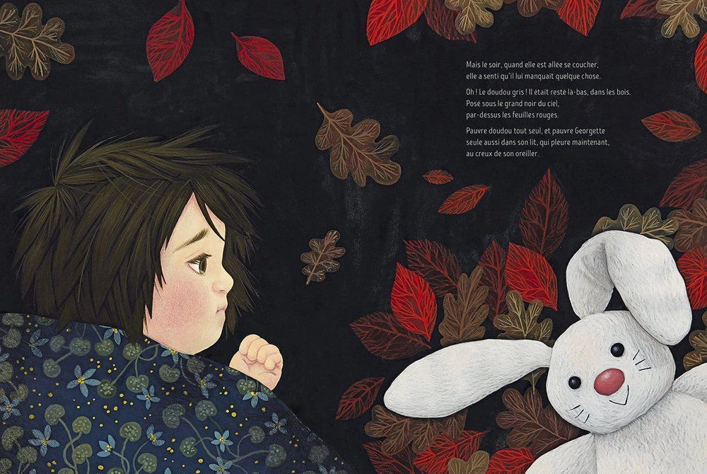 Georgette se promène dans les bois. Ça sent bon la terre, la pluie, les champignons. Elle installe son doudou sur un lit de feuilles. Elle admire les belles couleurs de la forêt… Mais le soir, au coucher, il lui manque soudain quelque chose : elle a oublié son doudou ! Là -bas, tout seul sous le grand noir du ciel ! Et le lendemain, de retour sur les lieux, impossible de le retrouver. Courageuse et volontaire, Georgette s’entête. Elle cherche l’odeur perdue du dodo, dans ce grand dehors. Et elle réussit : elle ramènera chez elle un petit loup gris, un vrai, bien vivant, mariant la douceur du dedans… à l’odeur du dehors.