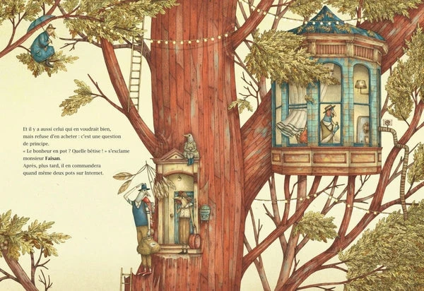 Monsieur Pigeon vend du bonheur en pot. Petit ou grand format, en pack de six ou modèle décoré pour Noël. Dans le bois qu’il visite ce jour-là , chacun des oiseaux en achète selon ses moyens, sa personnalité, pour offrir ou partager.