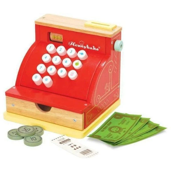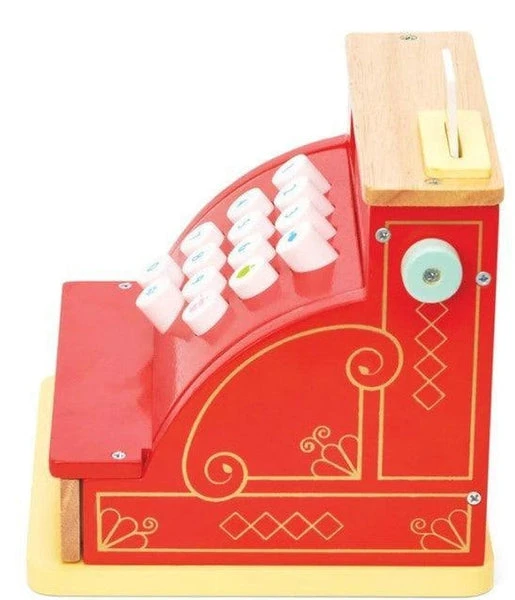 Cette caisse de style rétro et ses détails vintages en peinture dorée comprend un ticket de caisse en bois, un tiroir à ressort et de l’argent fictif en bois et papier.