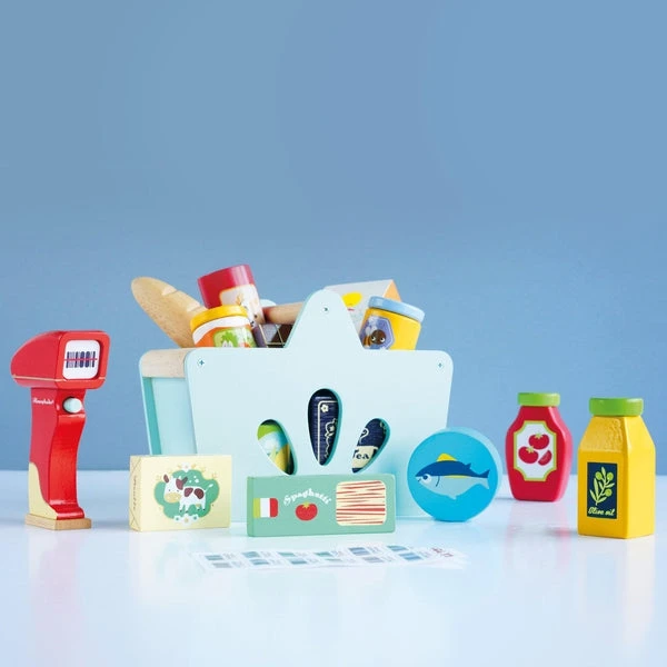 Découvrez le panier de courses et le scanner de Le Toy van, l’ensemble d’épicerie en bois, indispensable pour jouer à la marchande.