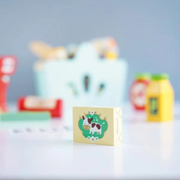 La boîte contient un élégant panier et une douzaine d’articles d’épicerie en bois, un lecteur de codes-barres amusant et des autocollants pour codes-barres.Â
