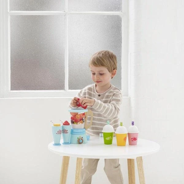 Découvrez le set de blender et fruits de Le Toy Van. Un ensemble de jouets en bois pour faire come les grands et préparer de délicieux smoothies à la fraise, la banane et même au kiwi. Les fruits se coupent en deux grâce à un velcro et un petit couteau, et la jarre du blender est amovible.