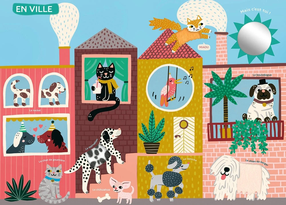 Quatre planches sur les thèmes du cirque, de la forêt, de la ville et de la mer. Chaque page comporte un miroir, des matières à toucher et des surprises.