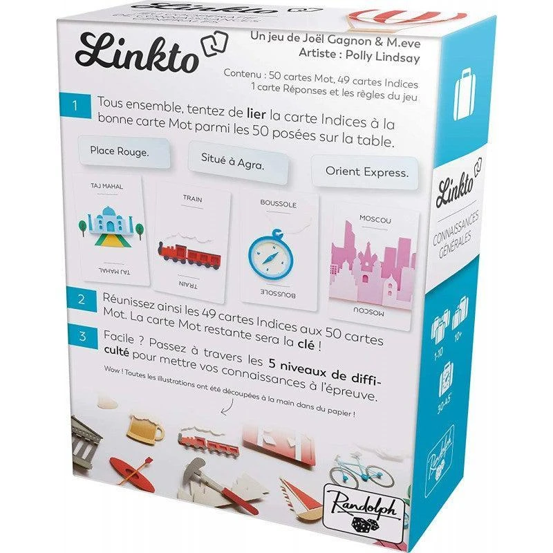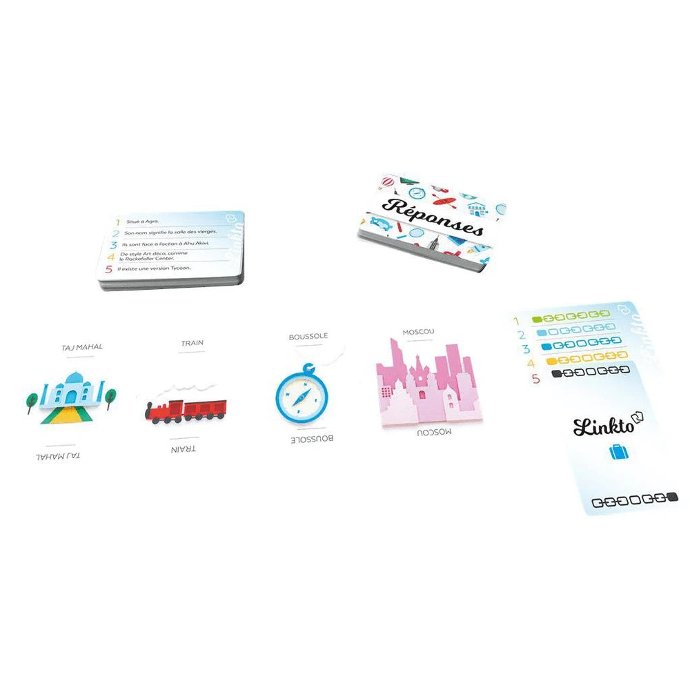 Tous ensemble, tentez de lier les 49 cartes Indice aux 50 cartes Mot posées sur la table. La carte Mot restante sera la clé! Facile? Passez les 5 niveaux de difficulté pour mettre vos connaissances à l’épreuve. On y parle de monuments célèbres, de capitales exotiques, de moyens de transport et d’orientation… Idéal pour parcourir les 4 coins du globe depuis son salon. A jouer en famille avec vos p’tits loulous dès 8 ans !