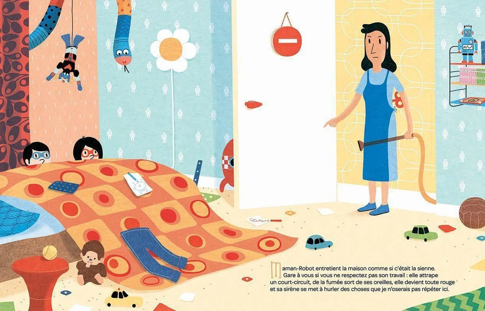 Or, depuis quelque temps, cette maman-robot semble déréglée : elle fait de grands discours devant sa glace, elle dit qu’elle veut avoir du temps pour elle et un beau jour, elle se met carrément en grève !