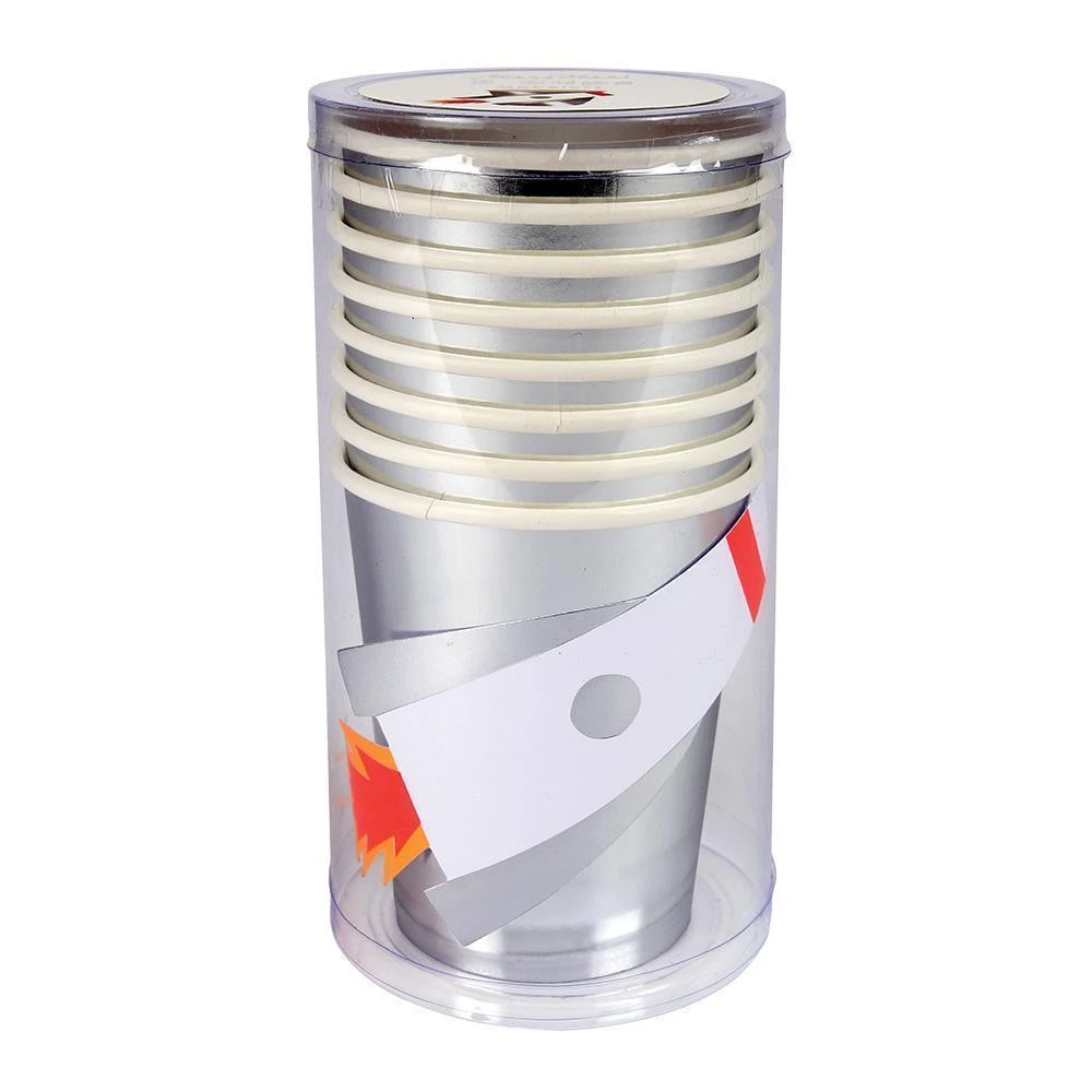 De jolis verres en carton argentĂ© avec fusĂ©e adhĂ©sive pour donner un air futuriste Ă vos fĂŞtes d’anniversaire. IdĂ©al pour les petit(e)s explorateurs(trices) de l’espace!