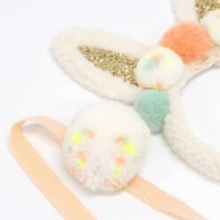Il suffit de porter le serre-tête avec ses oreilles de lapin pailletées et ses nombreux pompons colorés et d’enfiler la queue de lapin en pompon !