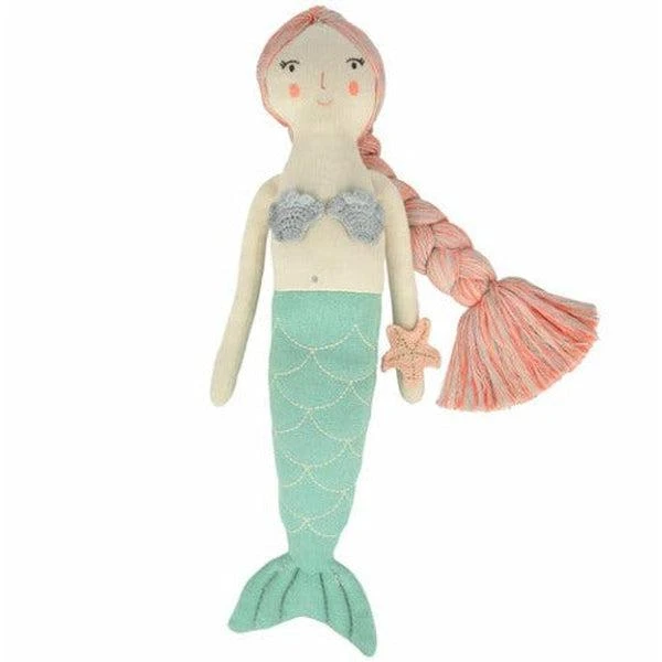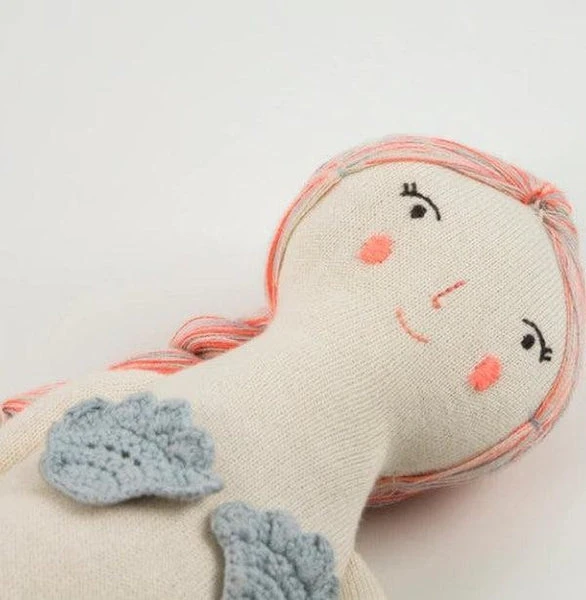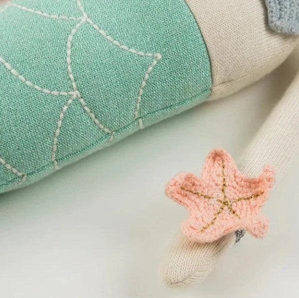 Cette magnifique poupée sirène se nomme Naomi, elle est entièrement en tricot de coton biologique tout doux. Craquez pour ses jolis détails surpiqués, ses beaux cheveux rose, son maillot de bain coquillage tout mignon et sa merveilleuse queue de sirène. Pour compléter sa jolie tenue, un bracelet coquillage se fixe sur son bras avec un élastique doré.
