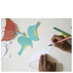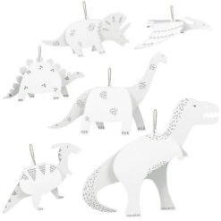 Chaque dinosaure est composé de deux pièces en papier cartonné qui s’assemblent avec simplicité. Une fois montés, ils pourront être coloriés puis posés ou bien suspendus au bout d’un fil doré.