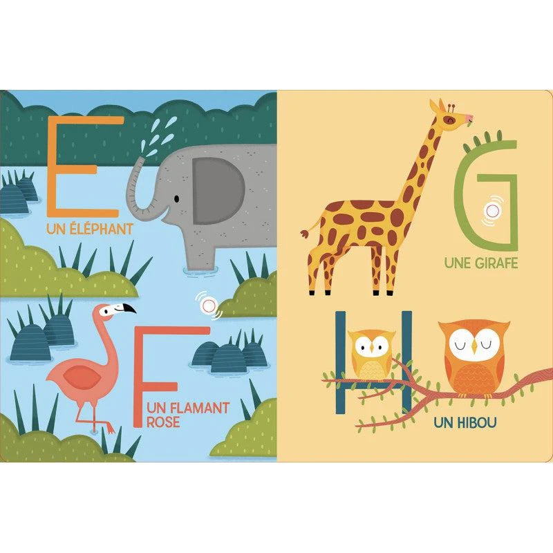 À chaque page, une puce sonore permet d’écouter la lettre et le nom de l’animal lus à voix haute. Il y a 26 sons à découvrir !
