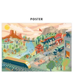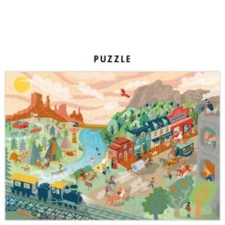Un poster reprĂ©sentant une scène contemporaine illustre une ville de l’ouest amĂ©ricain, chaque pièce du puzzle vient se superposer Ă cette illustration et transpose cette scène contemporaine au temps des cowboys et des indiens…