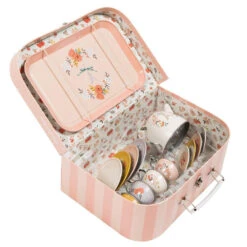 DĂ©couvrez ce magnifique service Ă thé aux couleurs poudrĂ©es, aux motifs fleuris et aux illustrations dĂ©licates et raffinĂ©es. Le tout est facile Ă transporter dans la valisette, idĂ©ale pour un goĂ»ter champĂŞtre entre ami(e)s.Â