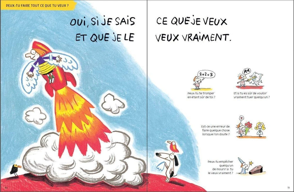 Six grandes questions illustrées de 36 situations quotidiennes et 144 sous-questions pour ouvrir le dialogue et initier les enfants à la réflexion philosophique, comme un jeu.