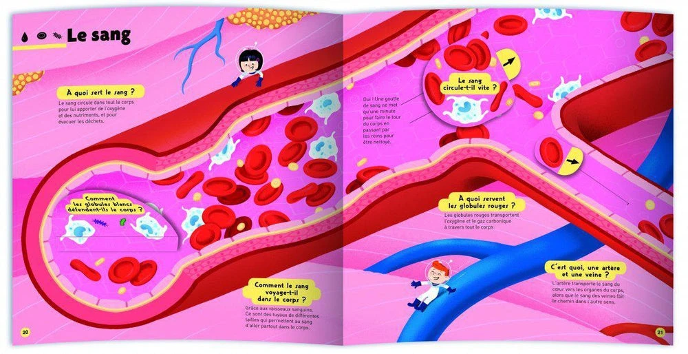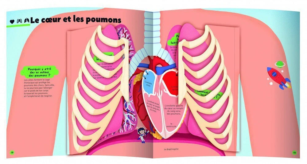 Tourne la roue pour savoir comment se passe la digestion, teste la rapiditĂ© de ton cerveau, ouvre la cage thoracique pour accĂ©der aux poumons puis au cĹ“ur, aide les globules blancs Ă attaquer les microbes, rĂ©pare un os cassĂ© ou encore dĂ©couvre comment on fait un bĂ©bé et comment il grandit dans le ventre de maman… Il y a tant de choses Ă apprendre ! Et en bonus : 6 activitĂ©s pour jouer avec son corps !