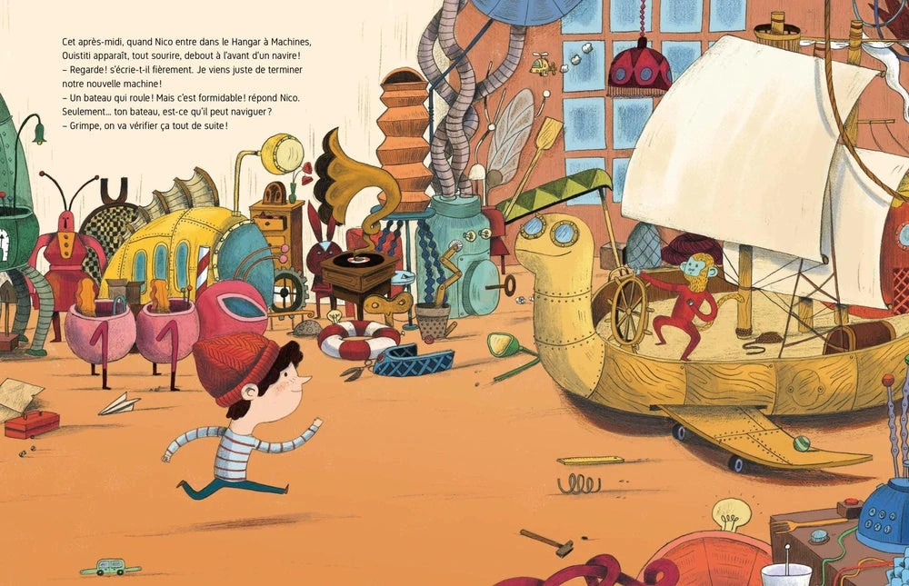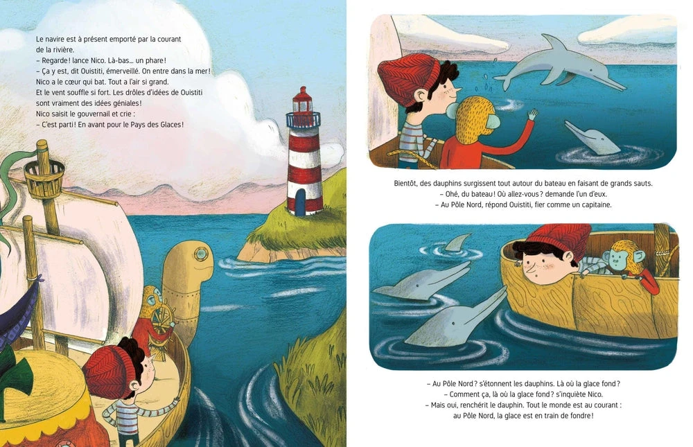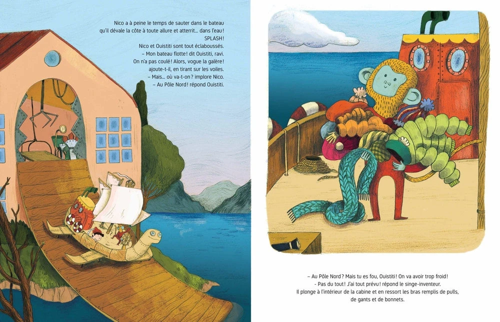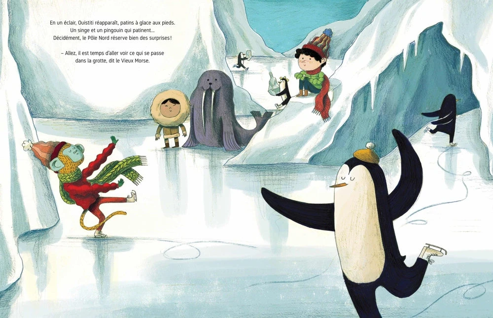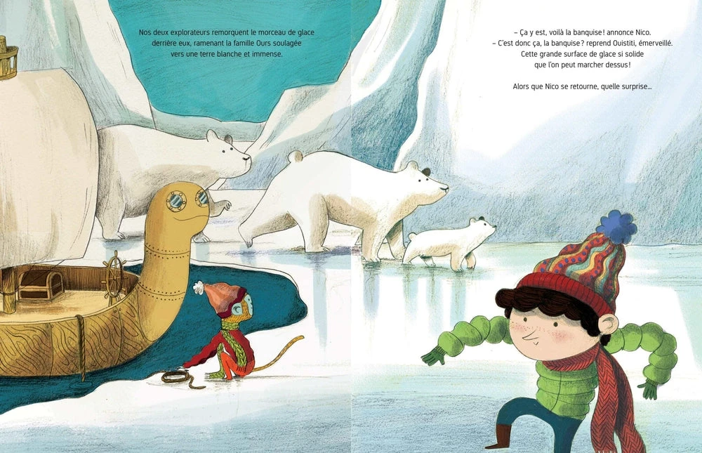 Quand Nico entre dans le Hangar à Machines, Ouistiti apparaît debout à l’avant d’un navire. Un navire qui roule, qui vogue et qui glisse sur la glace. Ça tombe bien car leur prochaine expédition les amène au Pôle Nord !