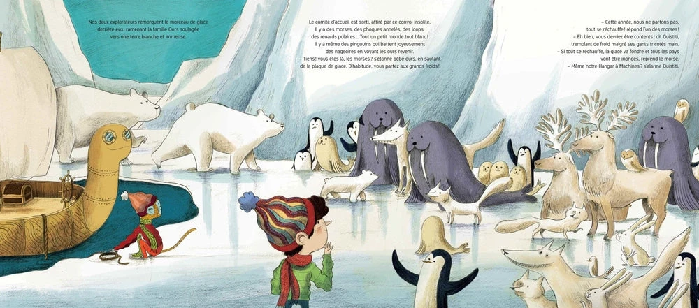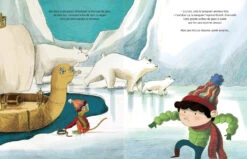 Au programme, une nuit dans un igloo, le beau spectacle des aurores boréales, une rencontre avec des ours et des renards polaires, des lapins blancs, un petit Inuit et un vieux Morse savant. Sans oublier des pingouins-sculpteurs sur glace qui sont bien à la peine car la banquise se met à fondre…une nouvelle mission pour nos 2 explorateurs !