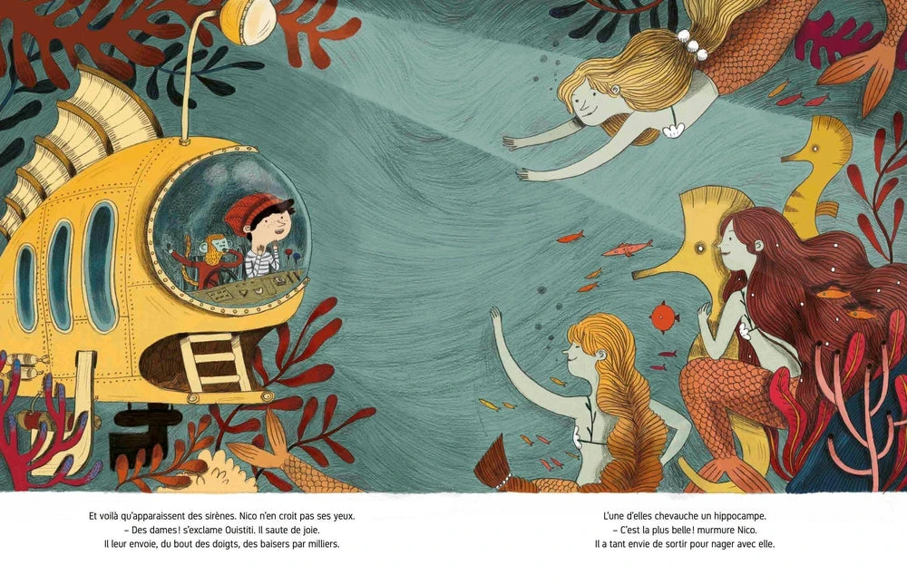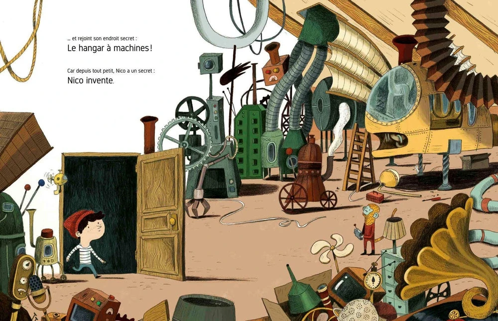 Chaque jour, dès que le soir tombe, Nico rejoint son endroit secret : Le Hangar à Machines. Là , il retrouve Ouistiti, son ami de toujours. Ce soir, nos deux amis peaufinent les derniers réglages de leur nouvel engin : un sous-marin pour aller explorer les fonds marins.
