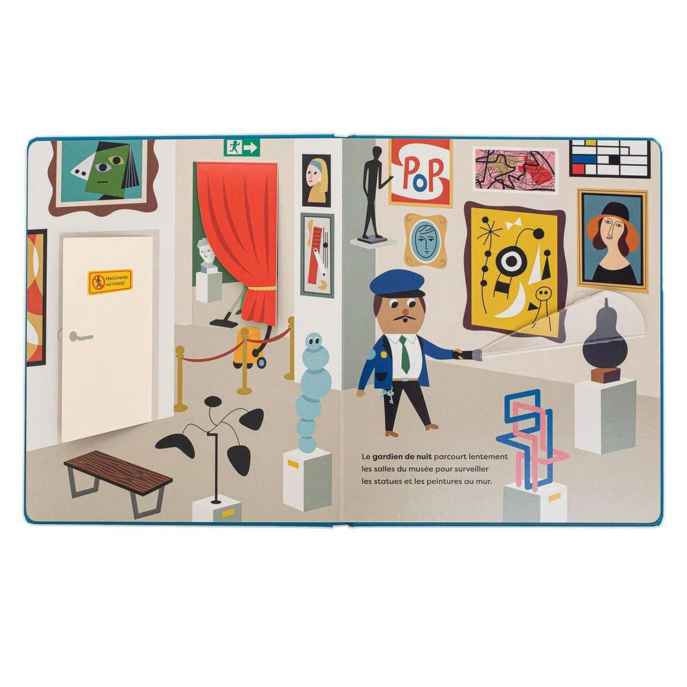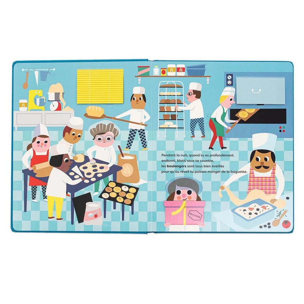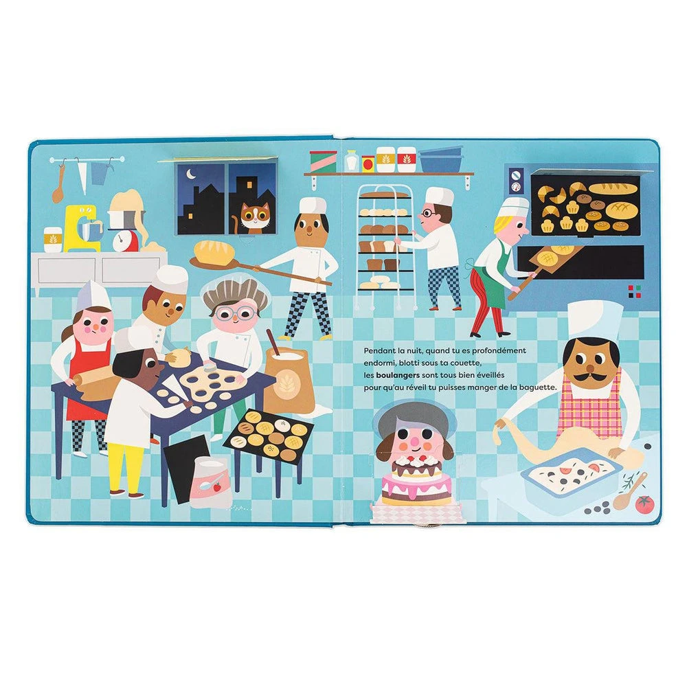 Ouvre la porte du four de la boulangerie, observe les poissons dans les filets du bateau de pêche, et pousse les portes d’un hôpital très fréquenté… tu verras comme le monde est animé la nuit aussi !