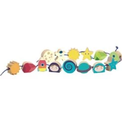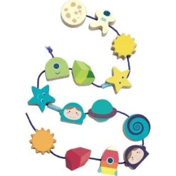 Avec ce jeu, dès 18 mois, votre p’tit bout d’chou développe la motricité fine en enfilant sur un lacet les 14 perles en bois illustrées sur le thème de l’espace.