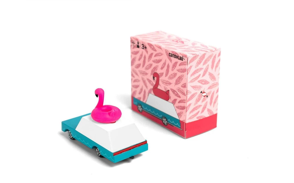 DĂ©couvrez la petite voiture bleue et sa bouĂ©e Flamant Rose en bois de la marque Candylab.Â